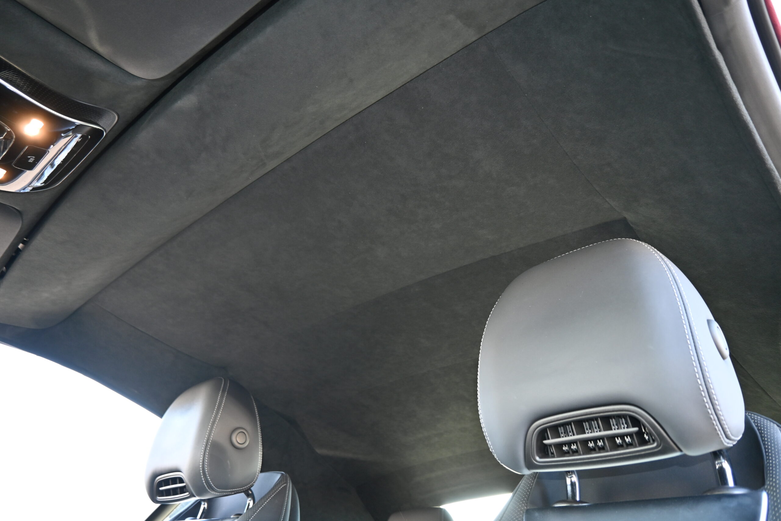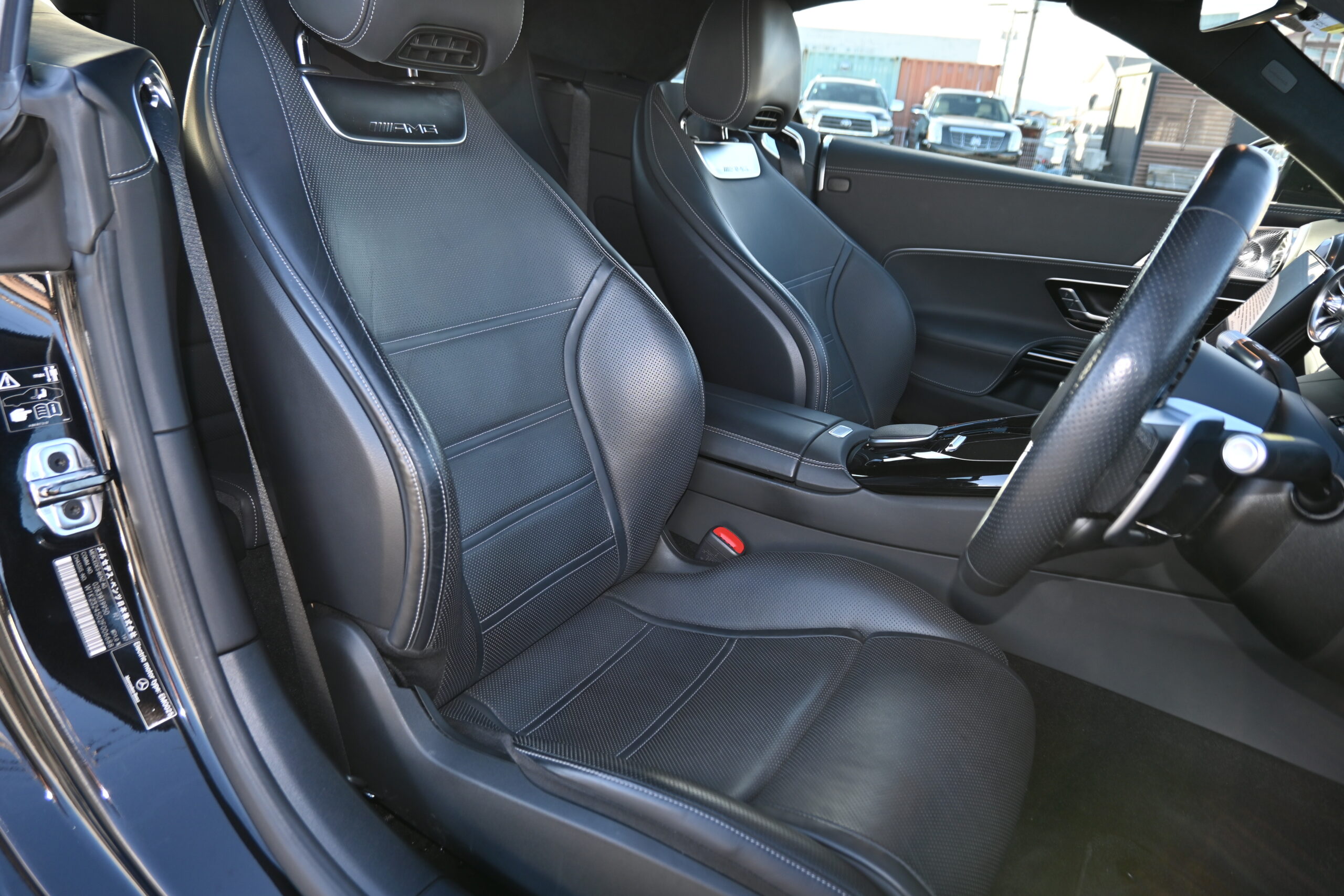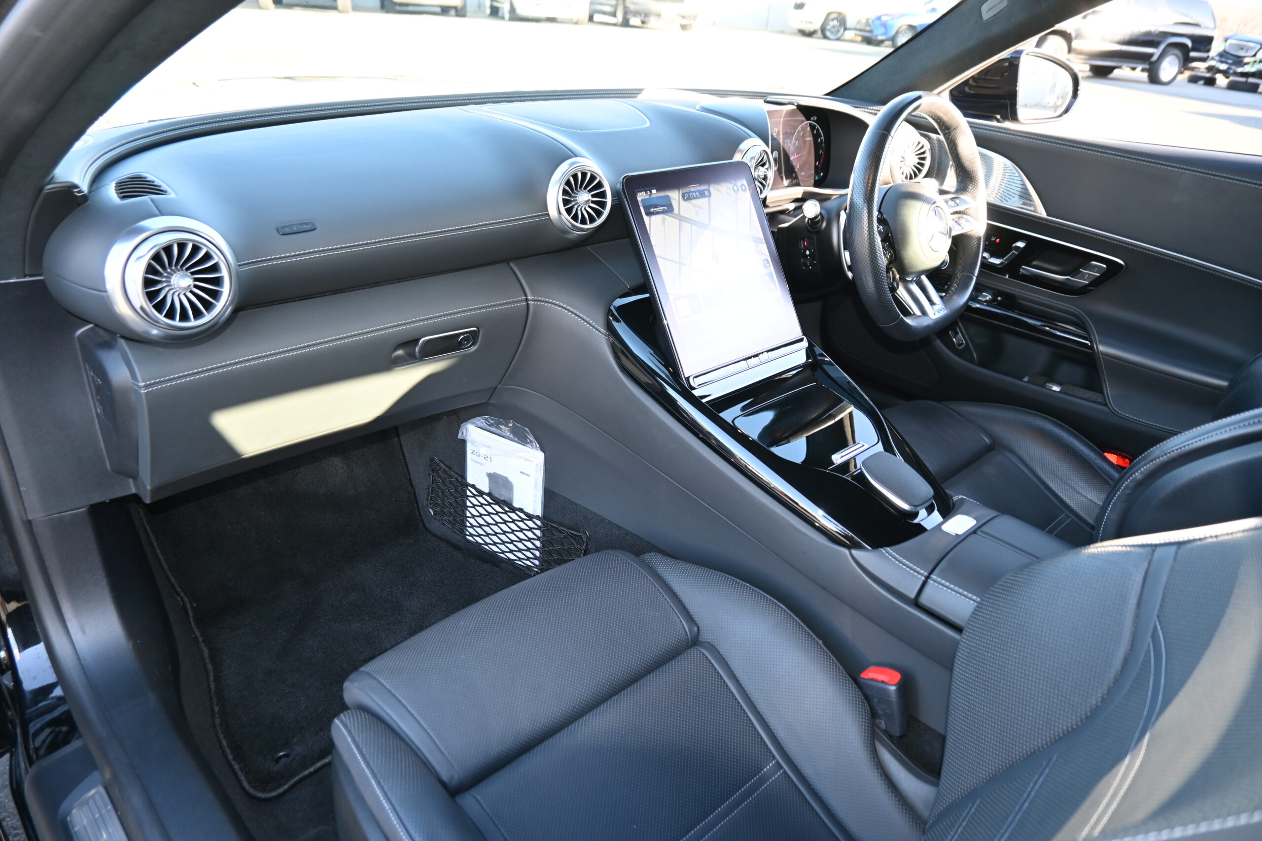 目を引く レッドトップに AMGイエローキャリパーで、見た目のインパクトも抜群。内装は上質な 黒本革シートで、エアシート&シートヒーター、ステアリングヒーター付き。オープンでも快適に楽しめます。